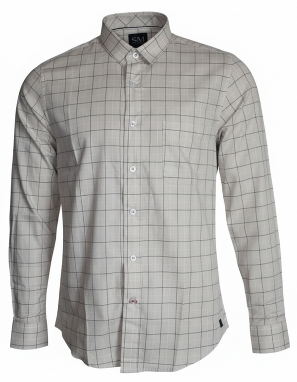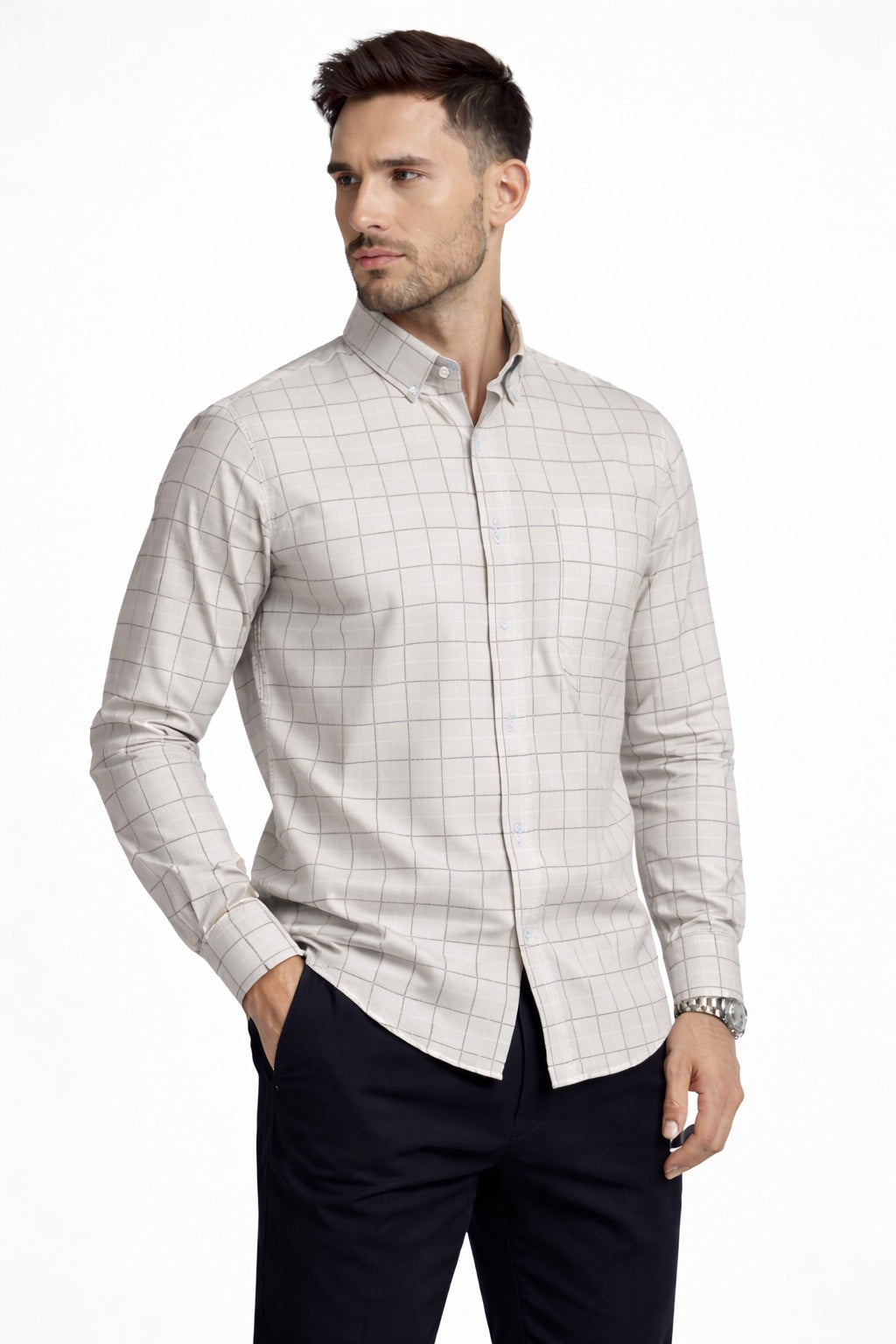 Camisa de corte regular fit que ofrece una silueta elegante y definida, ligeramente ajustada al torso, hombros y brazos para un look moderno. Confeccionada en 80% algodón y 20% poliéster en color beige con cuadricula. Presenta manga larga con puños abotonados, cuello camisero clásico, etiqueta de marca, cierre de botón frontal, bolsillo en la parte superior izquierda y etiqueta S&M al interior.