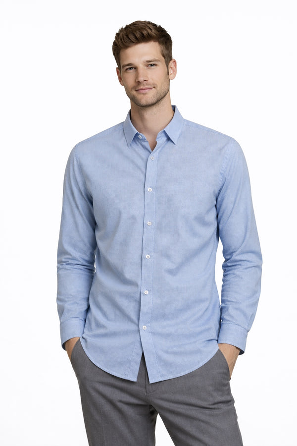Camisa de corte regular fit que ofrece una silueta elegante y definida, ligeramente ajustada al torso, hombros y brazos para un look moderno. Confeccionada en 80% algodón y 20% poliéster en tela de mini cuadros color azul. Presenta manga larga con puños abotonados, cuello camisero clásico, etiqueta de marca, cierre de botón frontal y etiqueta S&M al interior.