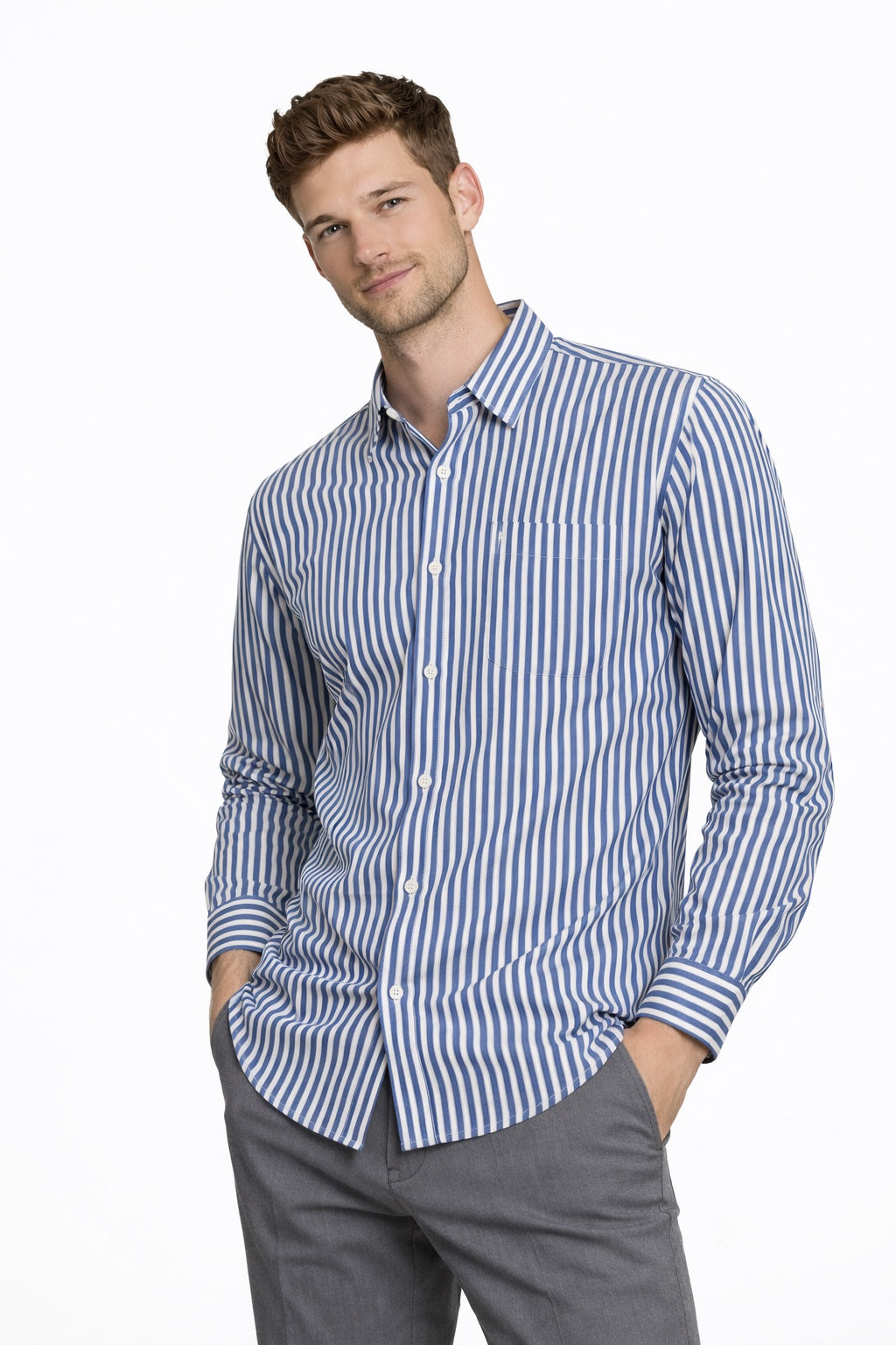 Camisa de corte regular fit que ofrece una silueta elegante y definida, ligeramente ajustada al torso, hombros y brazos para un look moderno. Confeccionada en 80% algodón y 20% poliéster en tela rayada de color azul con blanco. Presenta manga larga con puños abotonados, cuello camisero clásico, etiqueta de marca, cierre de botón frontal, bolsillo en la parte superior izquierda y etiqueta S&M al interior.