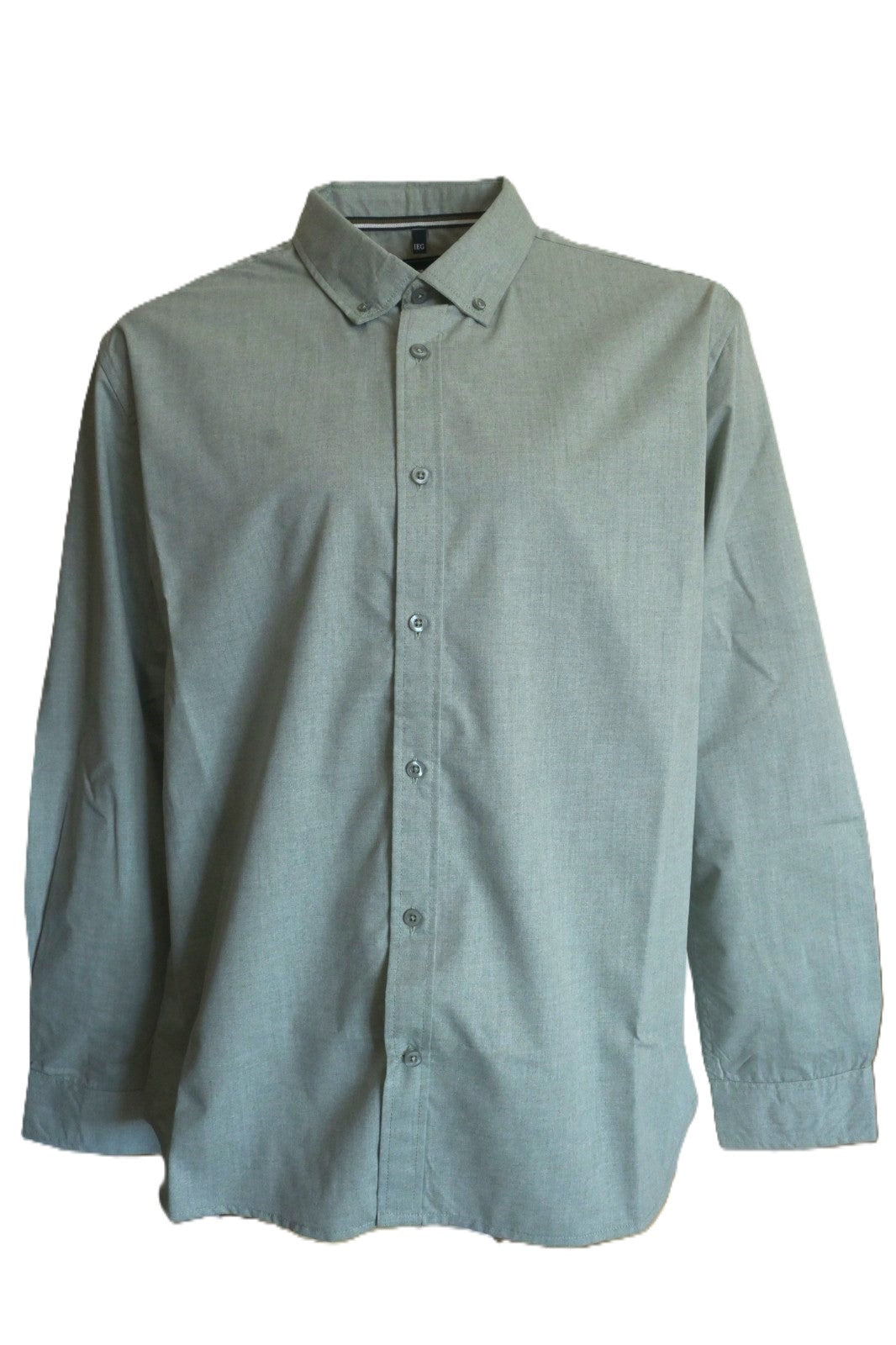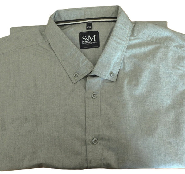 Camisa de corte regular fit que ofrece una silueta elegante y definida, ligeramente ajustada al torso, hombros y brazos para un look moderno. Confeccionada en 80% algodón y 20% poliéster con tela melange en color olivo. Presenta manga larga con puños abotonados, cuello camisero clásico, etiqueta de marca, cierre de botón frontal y etiqueta S&M al interior.