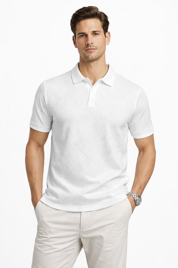 Polo color blanca de corte fit que ofrece una silueta elegante y definida, ligeramente ajustada al torso, hombros y brazos para un look moderno. Confeccionada en 50% algodón,  50% poliéster, textura en tela y etiqueta S&M al interior.