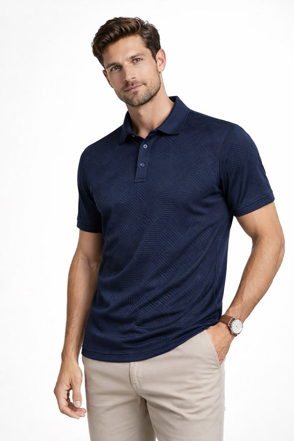 Polo color azul marino de corte fit que ofrece una silueta elegante y definida, ligeramente ajustada al torso, hombros y brazos para un look moderno. Confeccionada en 50% algodón,  50% poliéster, textura en tela y etiqueta S&M al interior.
