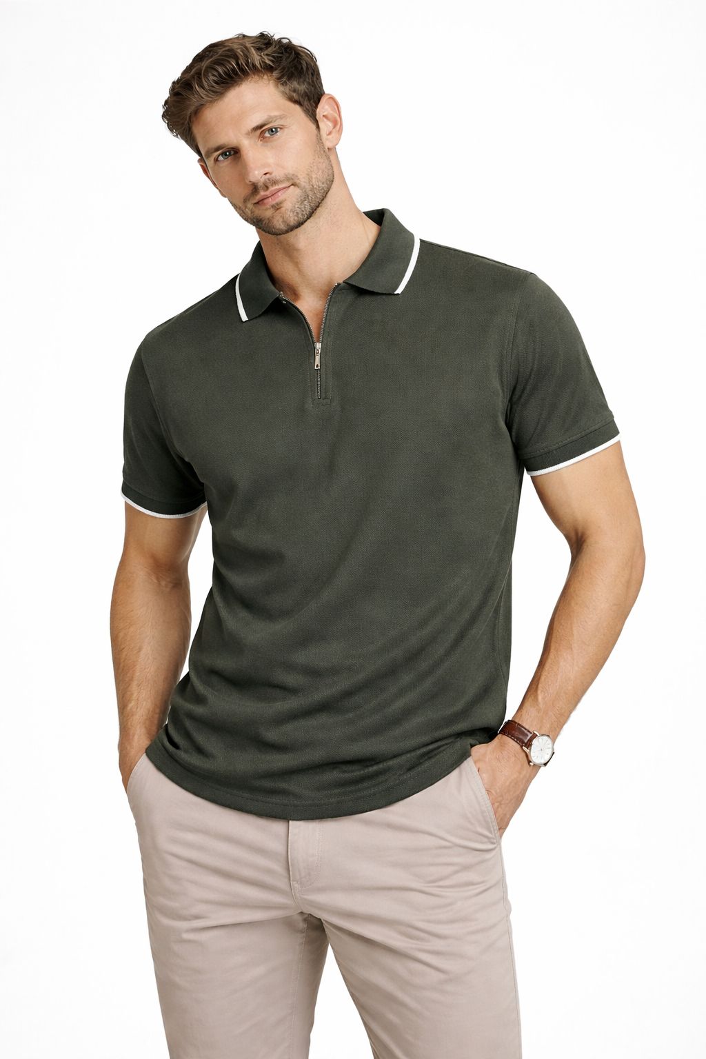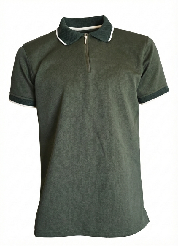 Polo Sherman Morgan de manga corta para hombre en color verde militar y textura en la tela. Presenta un filo en color blanco y cierre frontal.