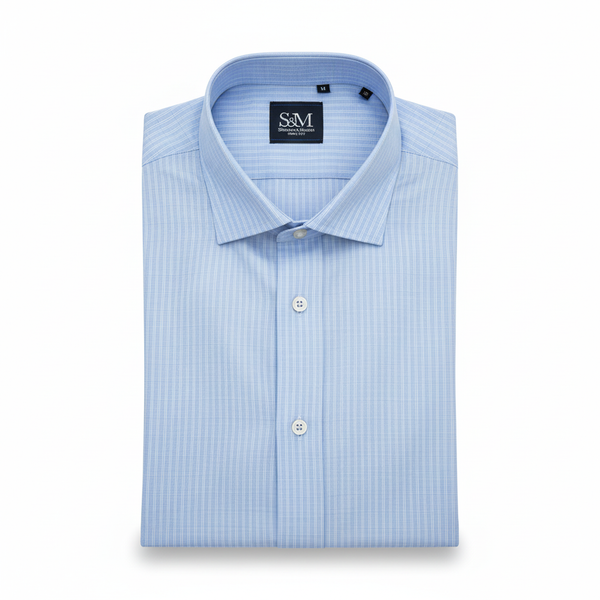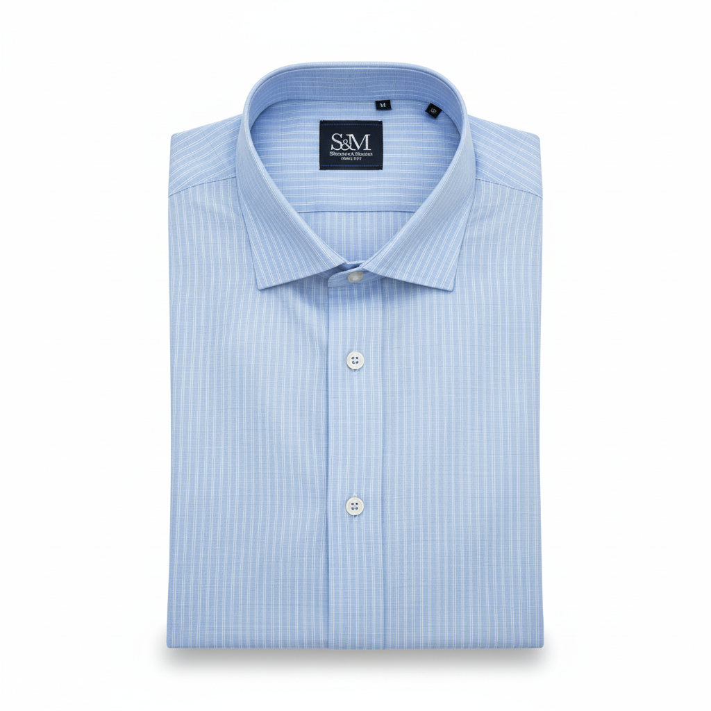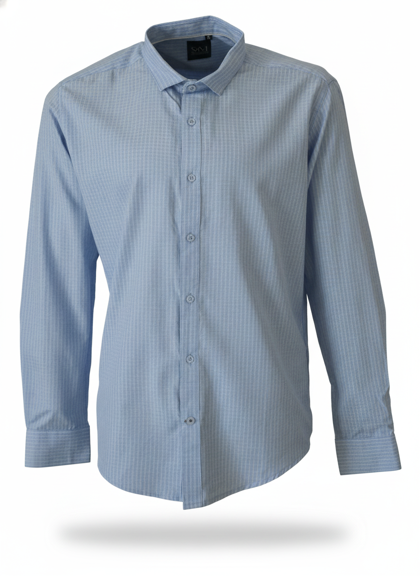 Camisa de corte regular fit que ofrece una silueta elegante y definida, ligeramente ajustada al torso, hombros y brazos para un look moderno. Confeccionada en 80% algodón y 20% poliéster en tela de mini cuadros color azul. Presenta manga larga con puños abotonados, cuello camisero clásico, etiqueta de marca, cierre de botón frontal y etiqueta S&M al interior.