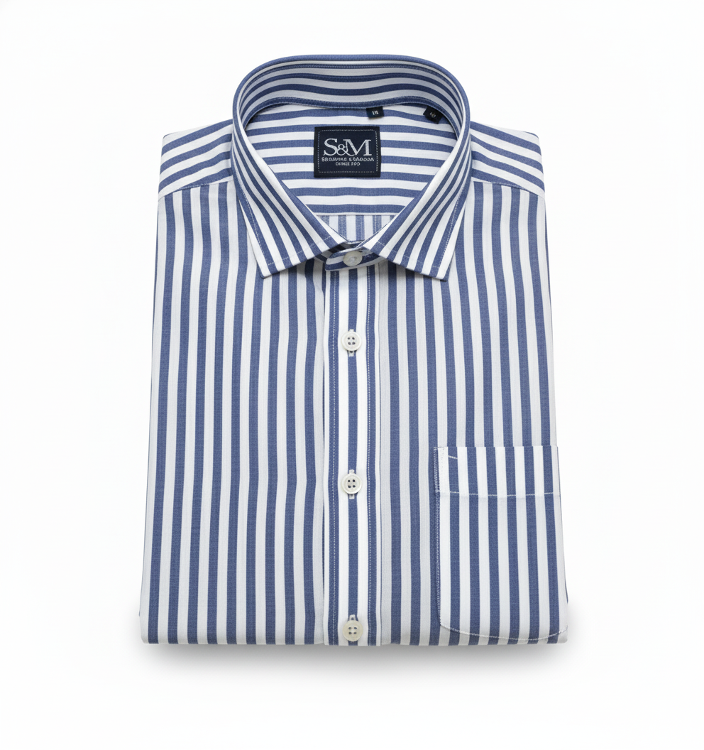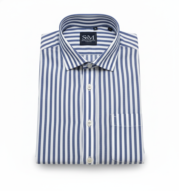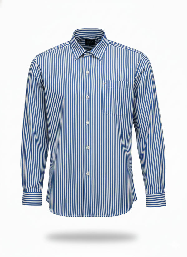 Camisa de corte regular fit que ofrece una silueta elegante y definida, ligeramente ajustada al torso, hombros y brazos para un look moderno. Confeccionada en 80% algodón y 20% poliéster en tela rayada de color azul con blanco. Presenta manga larga con puños abotonados, cuello camisero clásico, etiqueta de marca, cierre de botón frontal, bolsillo en la parte superior izquierda y etiqueta S&M al interior.