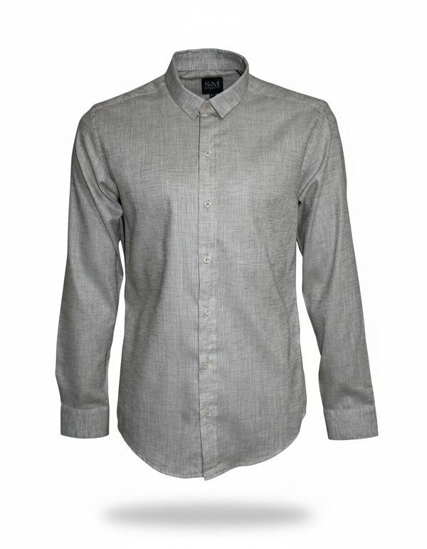 Camisa de corte regular fit que ofrece una silueta elegante y definida, ligeramente ajustada al torso, hombros y brazos para un look moderno. Confeccionada en 80% algodón y 20% poliéster con tela melange en color beige. Presenta manga larga con puños abotonados, cuello camisero clásico, cierre de botonadura frontal y etiqueta S&M al interior.