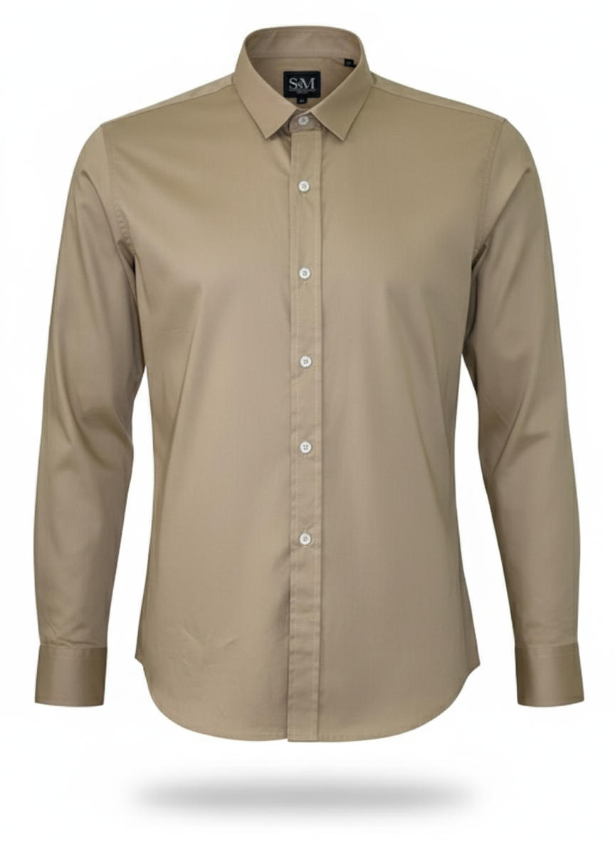Camisa de corte regular fit que ofrece una silueta elegante y definida, ligeramente ajustada al torso, hombros y brazos para un look moderno. Confeccionada en 80% algodón y 20% poliéster en tela lisa, color café claro. Presenta manga larga con puños abotonados, cuello camisero clásico, cierre de botonadura frontal y etiqueta S&M al interior.
