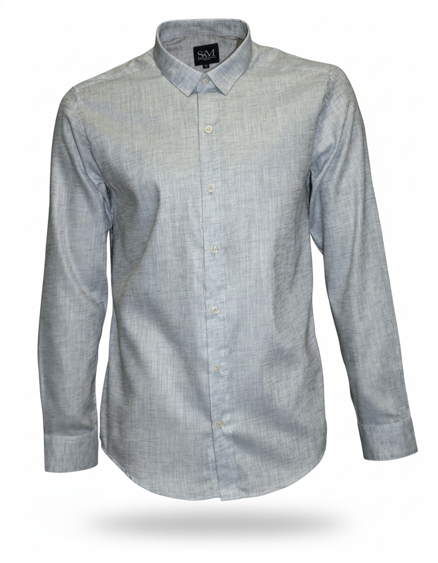 Camisa de corte regular fit que ofrece una silueta elegante y definida, ligeramente ajustada al torso, hombros y brazos para un look moderno. Confeccionada en 80% algodón y 20% poliéster con tela melange en color gris. Presenta manga larga con puños abotonados, cuello camisero clásico, cierre de botonadura frontal y etiqueta S&M al interior.