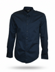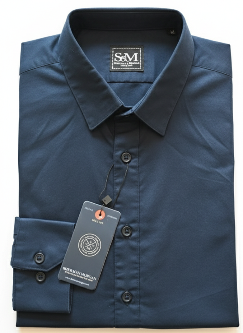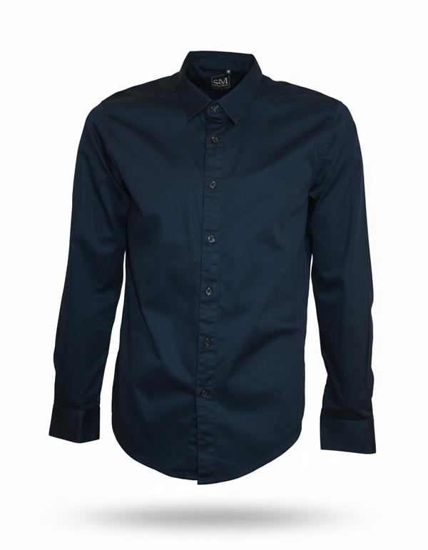 Camisa de corte regular fit que ofrece una silueta elegante y definida, ligeramente ajustada al torso, hombros y brazos para un look  moderno. Confeccionada en 80% algodón y 20% poliéster en tela lisa, color marino. Presenta manga larga con puños abotonados, cuello camisero clásico, cierre de botonadura frontal y etiqueta S&M al interior.