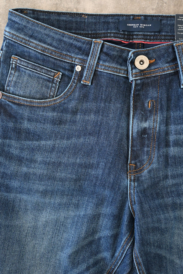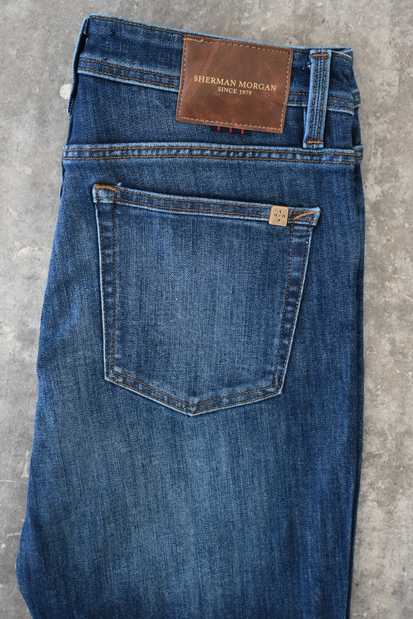 Descubre los jeans Sherman Morgan #SM748 para hombre, de corte slim fit. Confeccionados en 98% algodón y 2% elastano en raw denim, ofrecen comodidad y estilo clásico. Cuentan con cierre frontal por cremallera y botón personalizado de la marca, más un diseño de 5 bolsillos. Perfectos para outfits casuales o neo-dandy en tonos indigo.